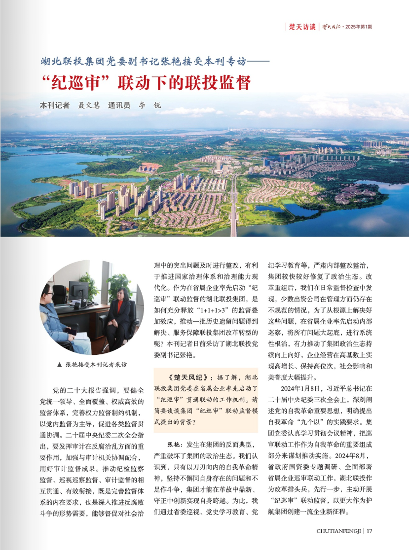 新年伊始,省紀(jì)委監(jiān)委《楚天風(fēng)紀(jì)》編輯部分別專訪集團(tuán)黨委書記、董事長劉俊剛、黨委副書記張艷和黨委巡察辦主任朱學(xué)軍,聚焦打造省屬國企巡察“聯(lián)投樣本”、深化“紀(jì)巡審”聯(lián)動、“同題共答”推進(jìn)巡察整改等主題,深度報道湖北聯(lián)投巡察監(jiān)督護(hù)航企業(yè)改革轉(zhuǎn)型做法經(jīng)驗,并于2025年第一期改版專欄刊發(fā)。集團(tuán)黨委副書記張艷、黨委巡察辦主任朱學(xué)軍訪談內(nèi)容摘要如下。