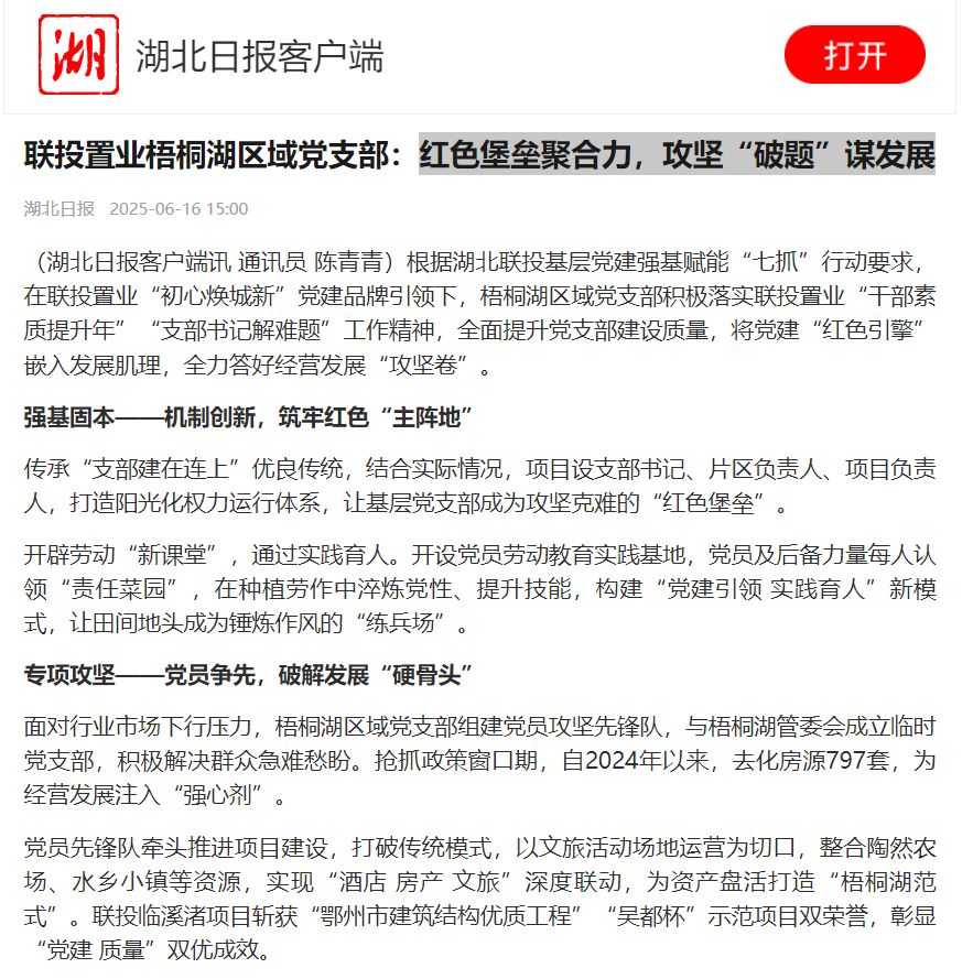 近日,聯(lián)投置業(yè)梧桐湖區(qū)域黨支部以紅色堡壘聚合力,攻堅“破題”謀發(fā)展,獲湖北日報專題報道,全文轉(zhuǎn)載如下: