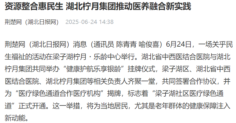 醫(yī)養(yǎng)新實(shí)踐,養(yǎng)老有“醫(yī)”靠。6月24日,湖北省中西醫(yī)結(jié)合醫(yī)院與湖北檸月集團(tuán)共同舉辦“健康護(hù)航 樂(lè)享銀齡”掛牌儀式,梁子湖區(qū)、湖北省中西醫(yī)結(jié)合醫(yī)院、湖北檸月集團(tuán)等相關(guān)負(fù)責(zé)人齊聚一堂,共同簽署合作協(xié)議,并為“醫(yī)療綠色通道合作醫(yī)療機(jī)構(gòu)”揭牌,標(biāo)志著“梁子湖社區(qū)醫(yī)療綠色通道”正式開(kāi)通。